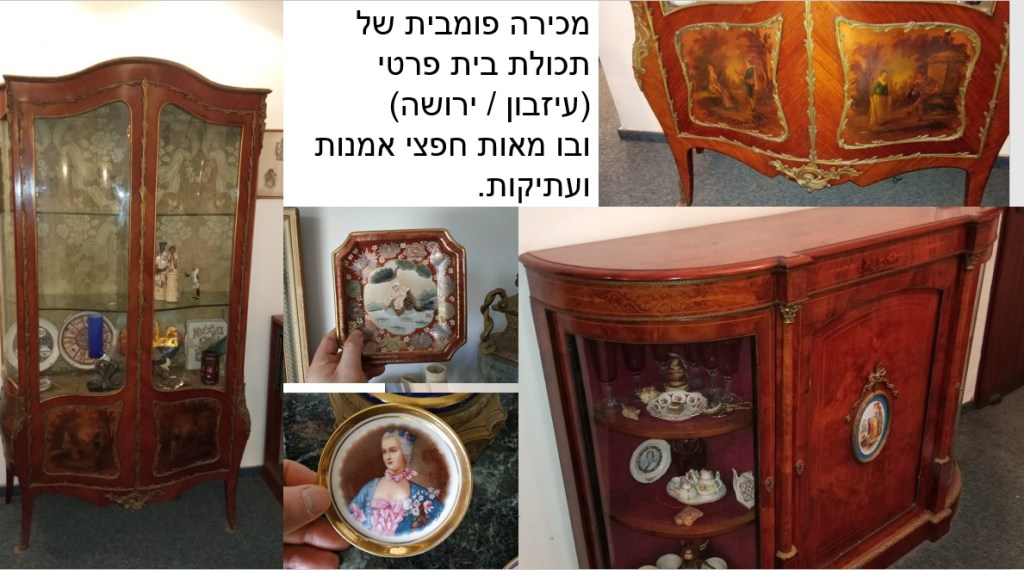 מומחה האמנות הוותיק יריב אגוזי מציג הצצה לתכולת בית פרטי (עיזבון / ירושה) שתועמד למכירה פומבית, בתכולה יש מאות חפצי אמנות, ריהוט עתיק, שטיחים פרסיים, כלי כסף וחפצי יודאיקה, כלי חרסינה וקריסטל, מנורות עתיקות, ציורים ופסלים, אוסף בולים ועוד
