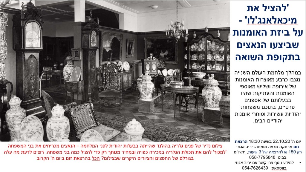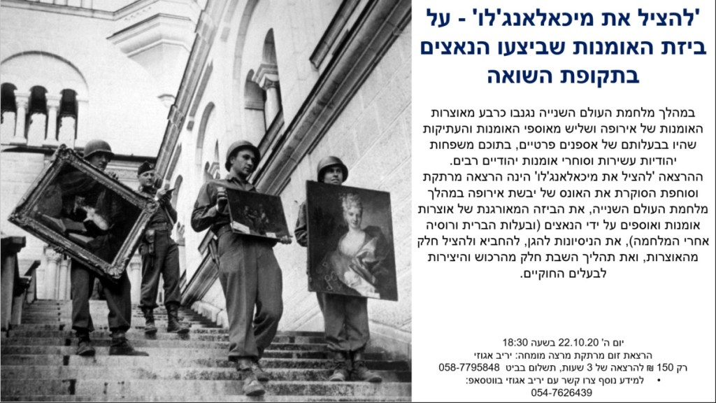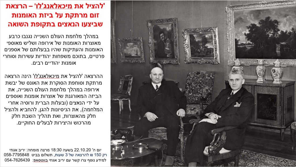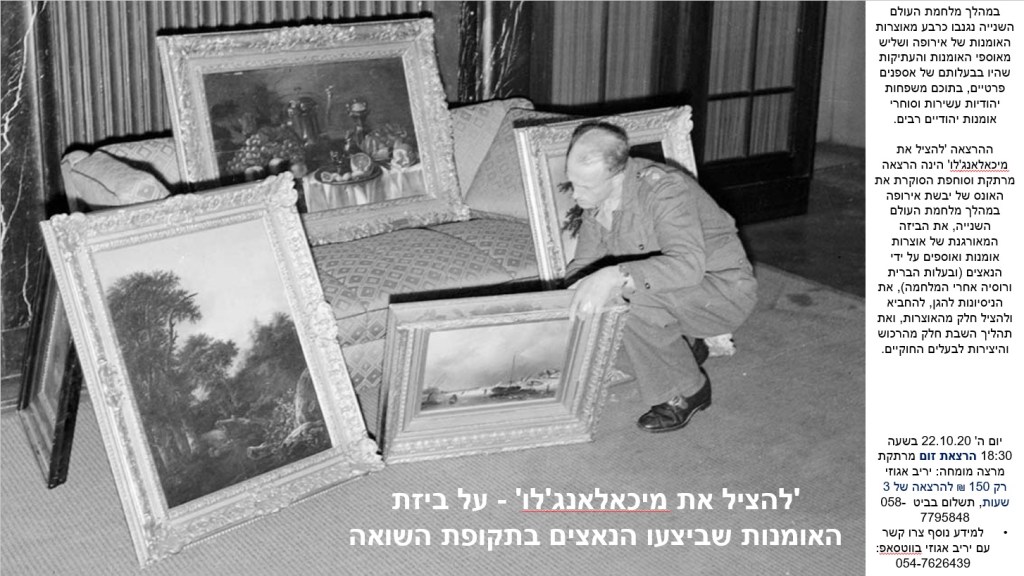 ההרצאה 'להציל את מיכאלאנג'לו' הינה הרצאה מרתקת וסוחפת הסוקרת את האונס של יבשת אירופה במהלך מלחמת העולם השנייה, את הביזה המאורגנת של אוצרות אומנות ואוספים על ידי הנאצים (ובעלות הברית ורוסיה אחרי המלחמה), את הניסיונות להגן, להחביא ולהציל חלק מהאוצרות, ואת תהליך השבת חלק מהרכוש והיצירות לבעלים החוקיים.