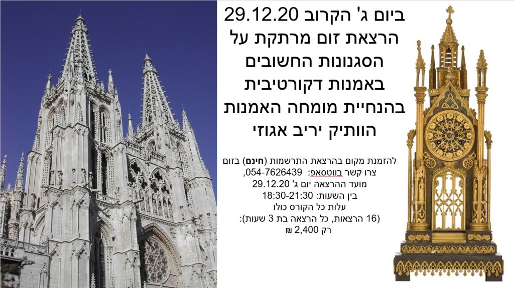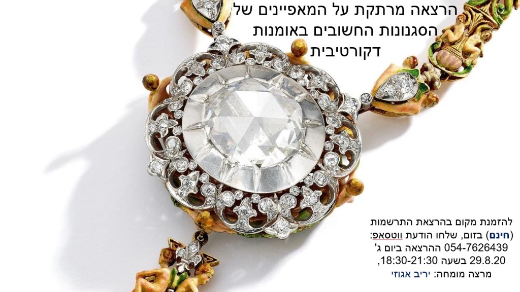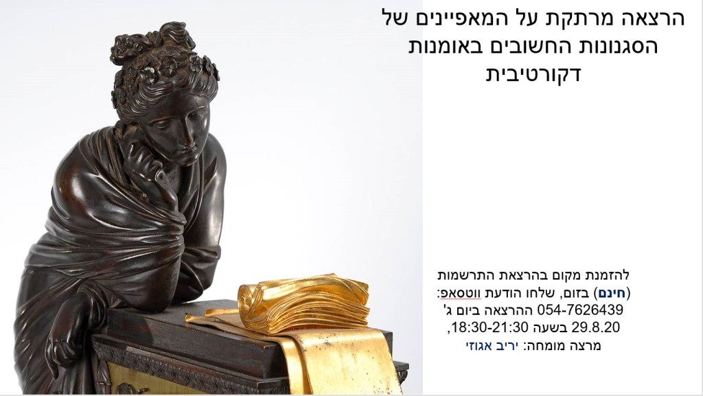 הרצאת זום מרתקת על המאפיינים של הסגנונות החשובים באמנות דקורטיבית עתיקה, בהנחיית מומחה האמנות יריב אגוזי 054-7626439 (ווטסאפ) ההרצאה הינה חלק מהקורס המקיף והמקצועי בישראל ללימודי הערכת אמנות, אספנות ועתיקות.