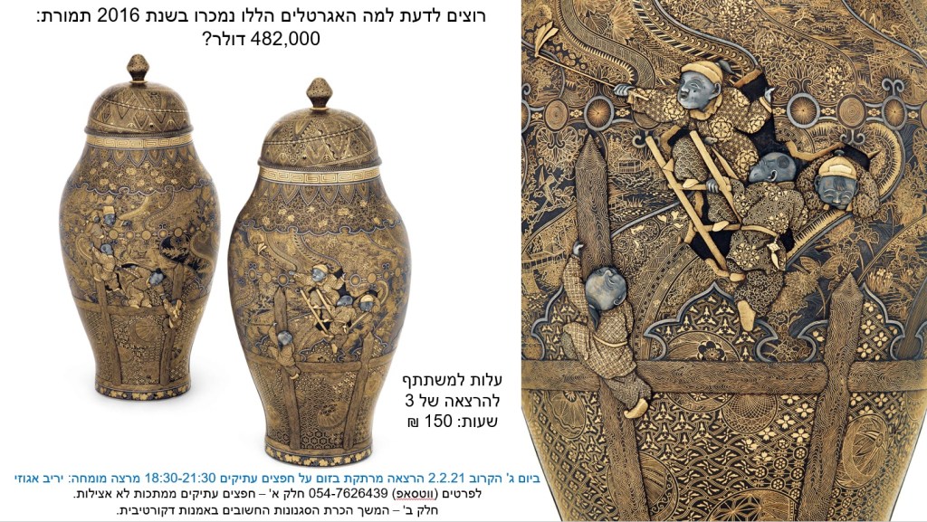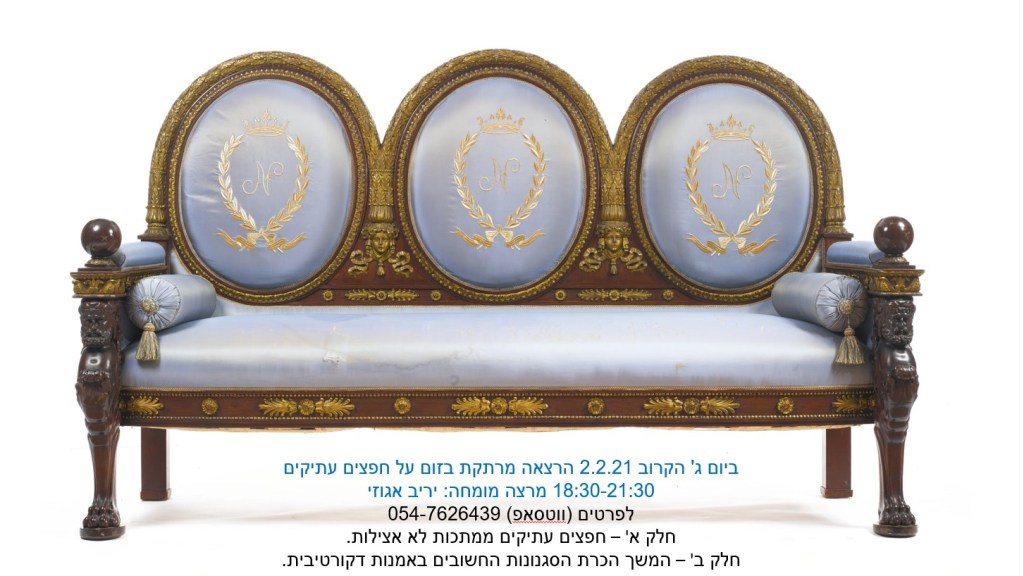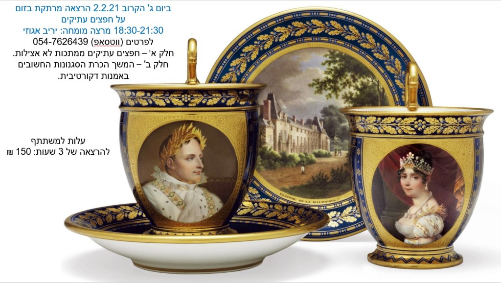 שוב נסחפתי, שוב במקום ללמד בזום על חפצים עתיקים 'רק' שלוש שעות…. דיברתי רצוף שלוש וחצי שעות…. הפעם הנושא היה חפצים עתיקים ממתכות לא אצילות והמשך הכרת הסגנונות החשובים באמנות דקורטיבית… תודה לעשרות הצופים שנרשמו וצפו בהרצאה, זה נושא מרתק ועוצר נשימה מבחינה ויזואלית. אני מתבייש להודות אבל אני נהנה יותר מהתלמידים… אני כמו ילד קטן בחנות ממתקים… החפצים הללו מרתקים ויפים כל כך… שזה עושה לי עיסוי לנפש….. ניפגש ביום ג' הבא בהרצאה חדשה בנושא אחר.