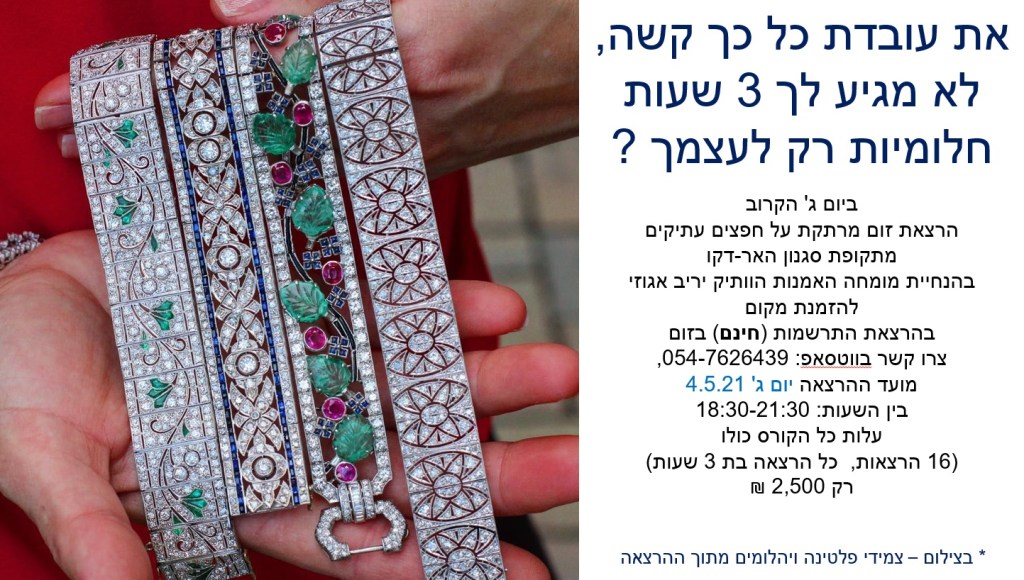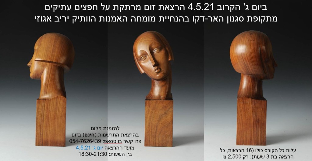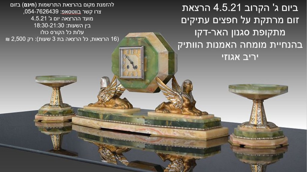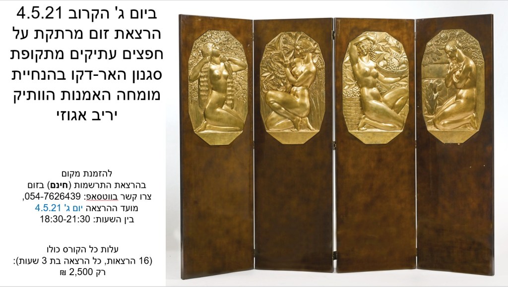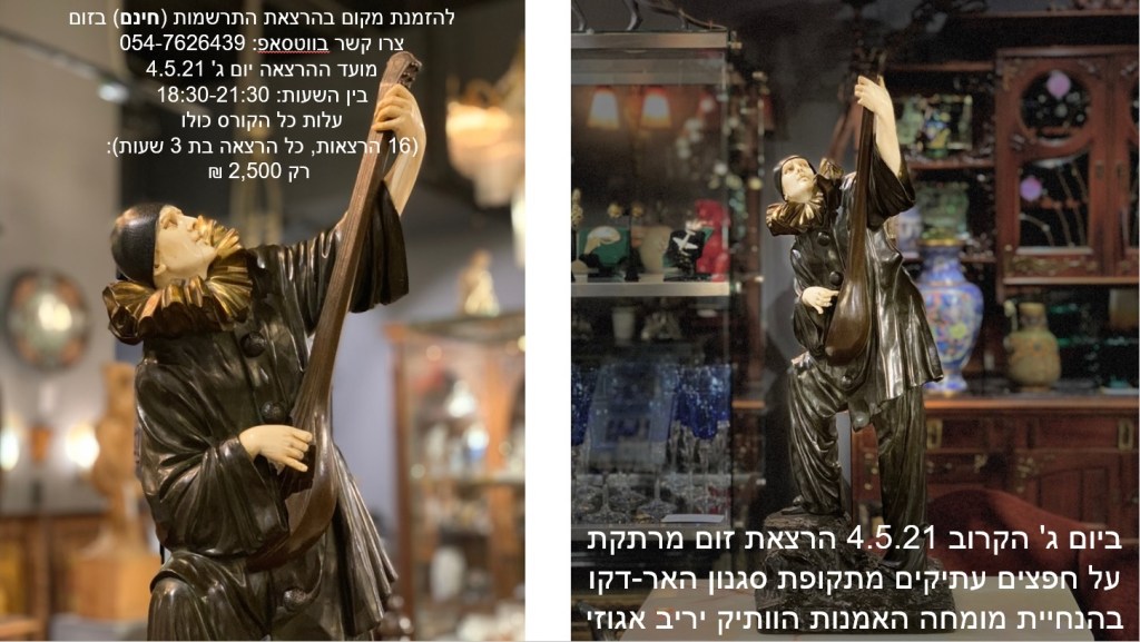 הרצאת זום מרתקת לחובבי עיצוב פנים, תרבות ואמנות על חפצי אמנות עתיקים ופרטי אספנות מתקופת סגנון האר דקו – מרצה מומחה: יריב אגוזי 054-7626439