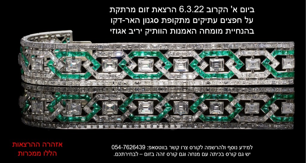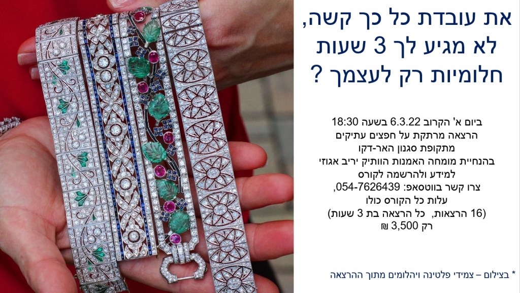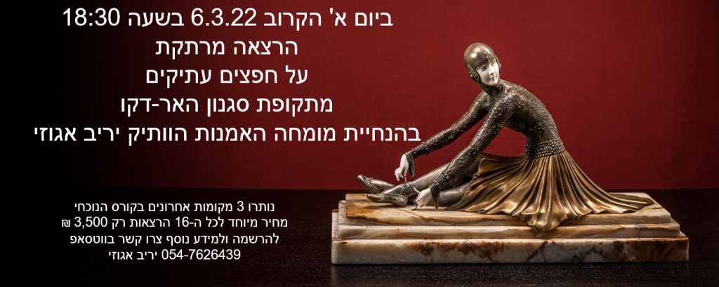 מהו בעצם סגנון האר דקו? מה המאפיינים של הסגנון? ואיך ניתן לזהות בקלות חפצים, רהיטים ותכשיטים עתיקים שיוצרו בתקופת סגנון אמנותי חשוב זה? הרצאה מרתקת של מומחה האמנות הוותיק יריב אגוזי 054-7626439