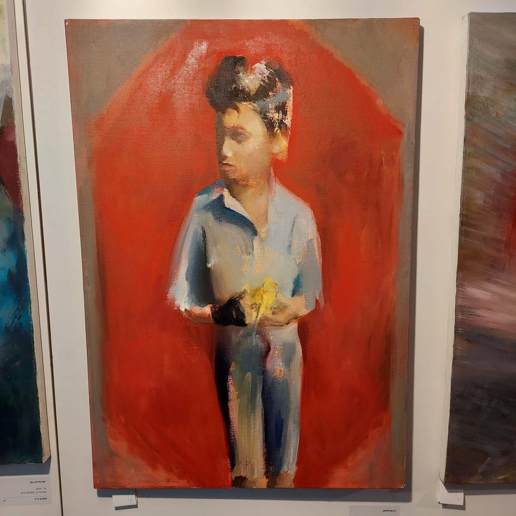 3. ציור נפלא של האמן דן אורימיאן שנקרא הילד, בו נראה ילד נושא דג צהוב על רקע אדום (עבודה פשוט מצויינת).