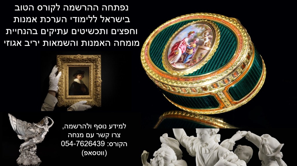בואו ללמוד בקורס הכי מקיף ומקצועי בישראל, ללימודי שמאות אמנות והערכת חפצים ותכשיטים עתיקים – הקורס בהנחיית מומחה האמנות הוותיק יריב אגוזי – למידע נוסף צרו קשר בווטסאפ עם מנחה הקורס 054-7626439