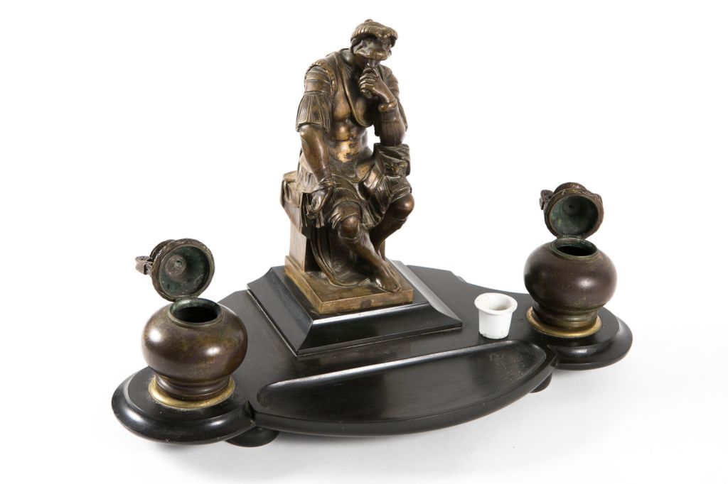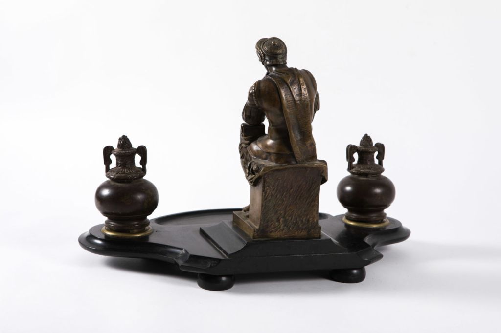 קסת דיו שולחנית כפולה, עשויה צפחה שחורה, מעוטרת פסל ברונזה ע"פ הפסל שמעטר את הקבר של לורנצו דה מדיצ'י, של האמן האיטלקי מיכאלנ'גלו, שתי קסתות דיו מברונזה, באר דיו אחת מפורצלן חסרה, ולקיימת פגם בשפה העשויה חרסינה, הבורנזה נושאת את חותם בית היציקה הצרפתי: Susse Freres, גובה: 30 ס"מ, אורך: 47 ס"מ.