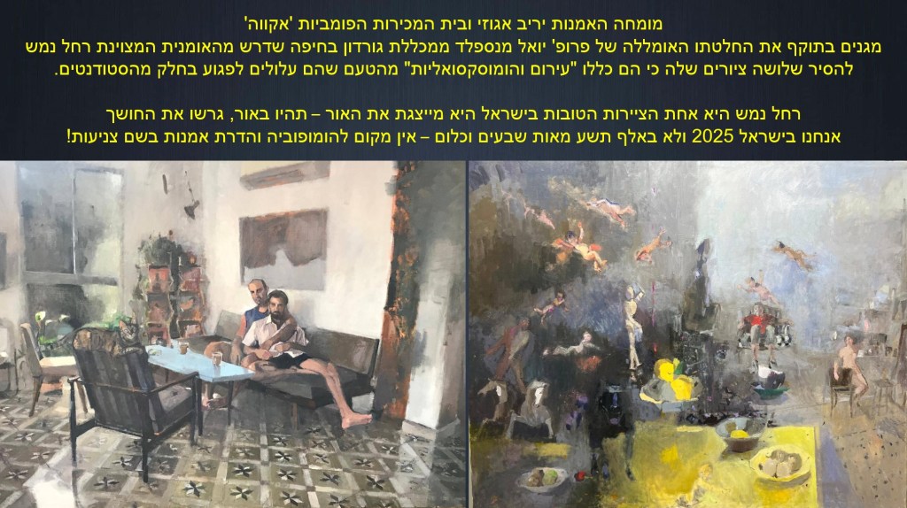 וכל הכבוד לה שהחליטה להסיר את כל התערוכה ולא נכנעה לבקשה המקוממת של פרופ' יואל מנספלד.