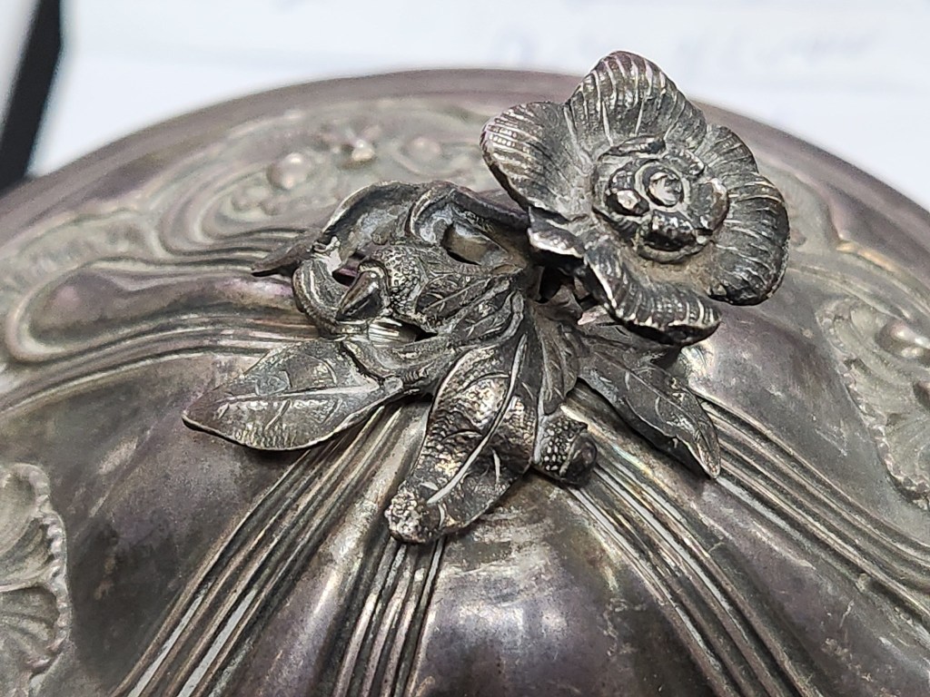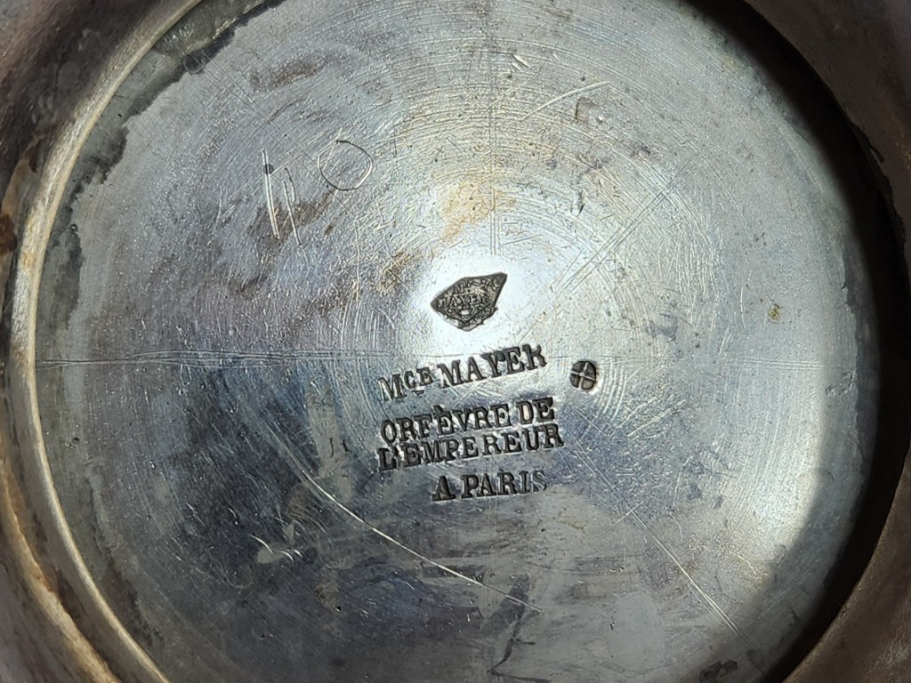 שמדובר בקומקום כסף צרפתי עתיק לתה, מתוצרת הצורף מוריס מאייר, עשוי כסף '950', חתום בחותמת כסף ובכיתוב: 'Maurice MAYER, Orfèvre de l'Empereur, à Paris', משקל: 702 גרם, הידית מעט משוחררת גובה: 18 ס"מ, אורך כולל: 29 ס"מ. (* מוריס מאייר (1801 – 1864) – חתם: Maurice Mayer, Orfevre de l'Empereur, a Paris