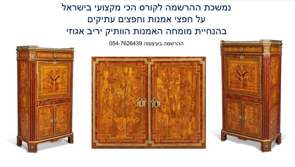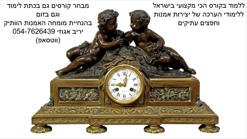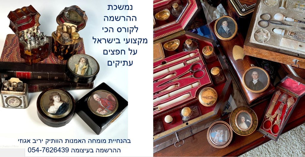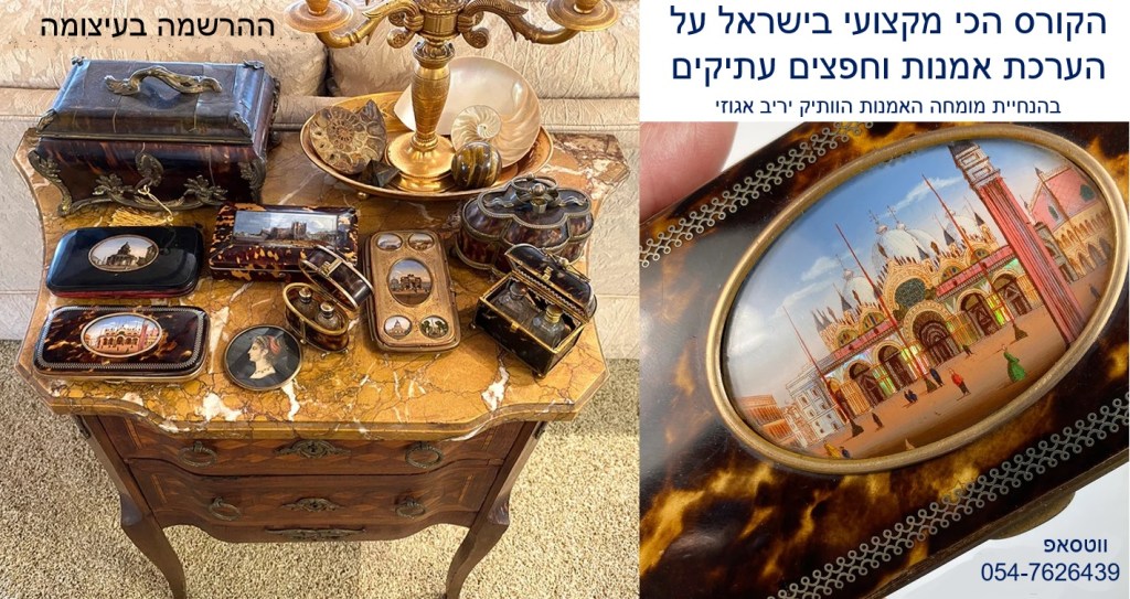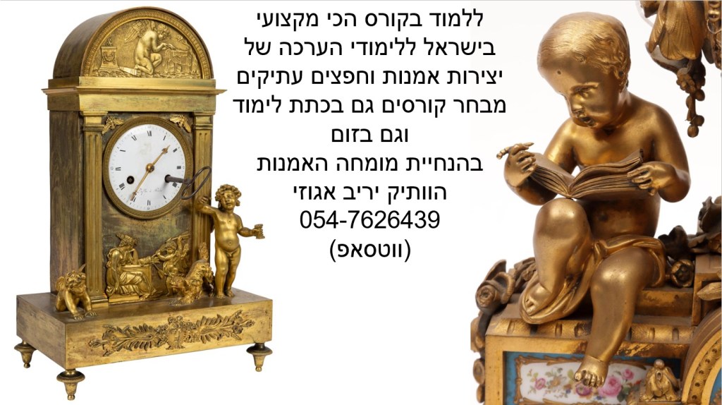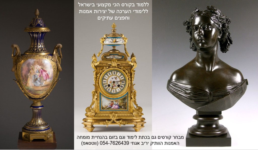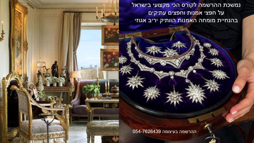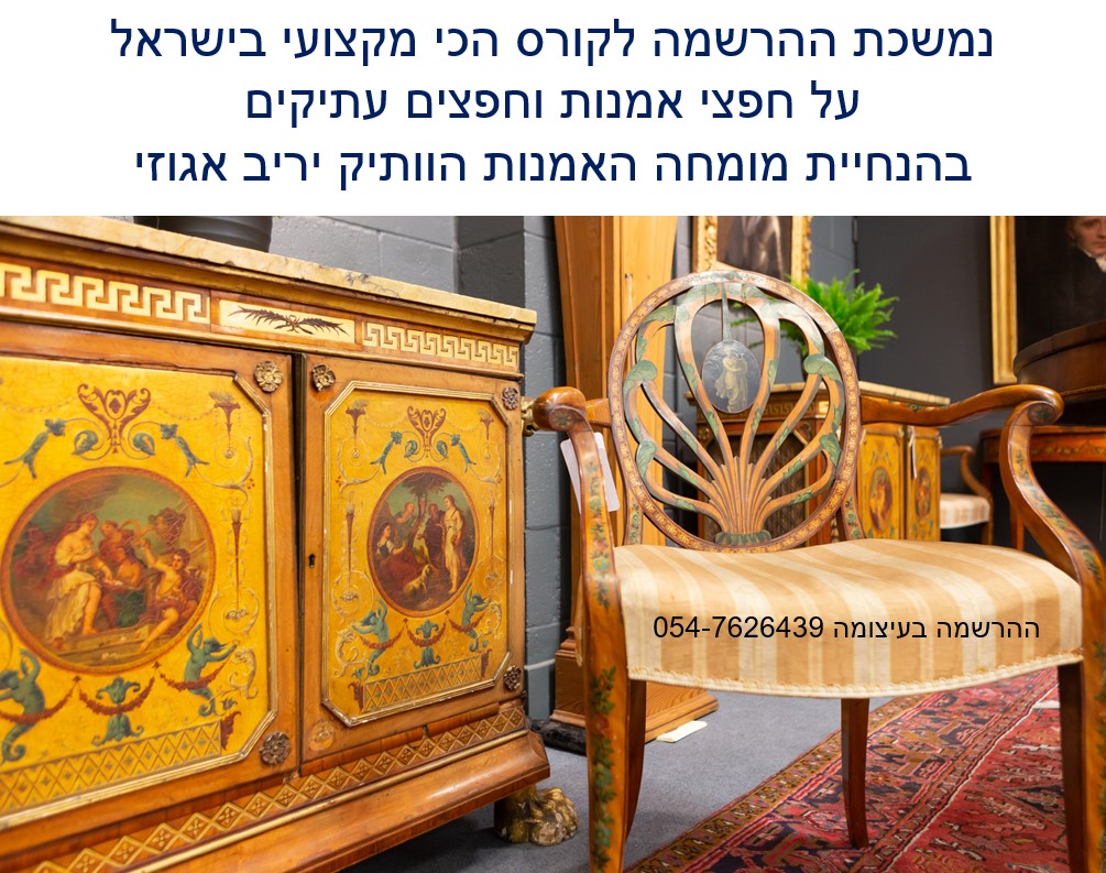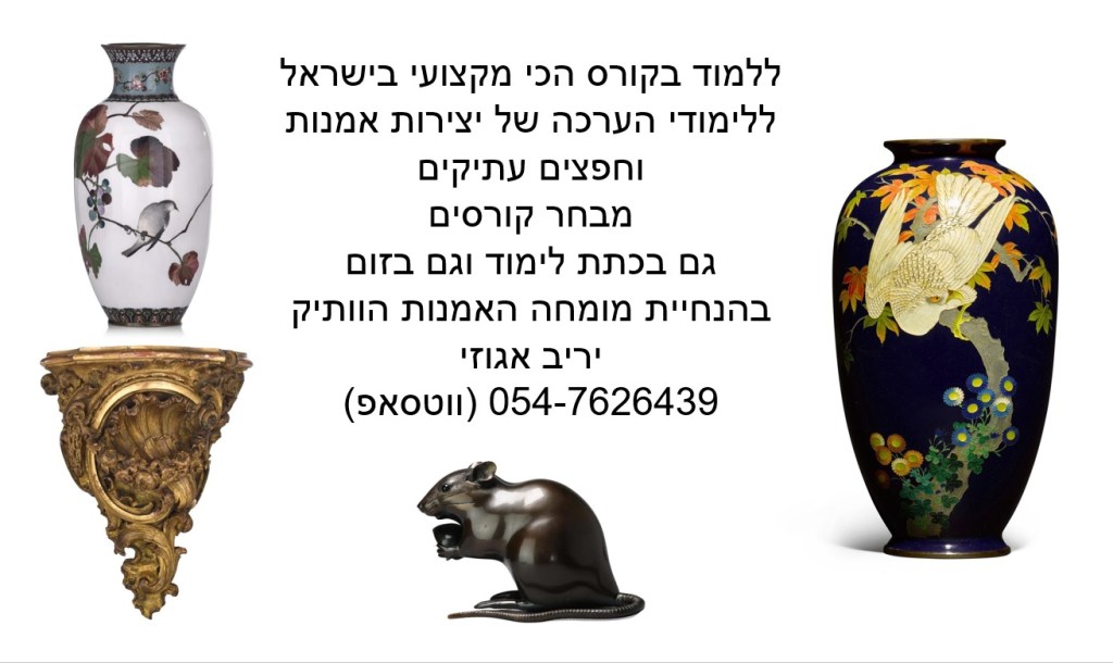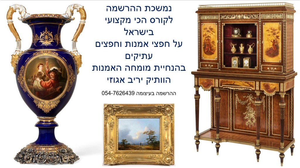 ההרשמה לקורס המוביל בישראל על חפצי אמנות ועתיקות בעיצומה – הקורס בהנחיית שמאי האמנות יריב אגוזי המתמחה בהערכה של יצירות אמנות ישראלית ובינלאומית, תכשיטים וחפצים עתיקים, יודאיקה, כלי כסף, אמנות עתיקה מהמזרח הרחוק, הודו ואמנות איסלמית, פרטי אספנות ועוד – יריב אגוזי 054-7626439 (ווטסאפ)