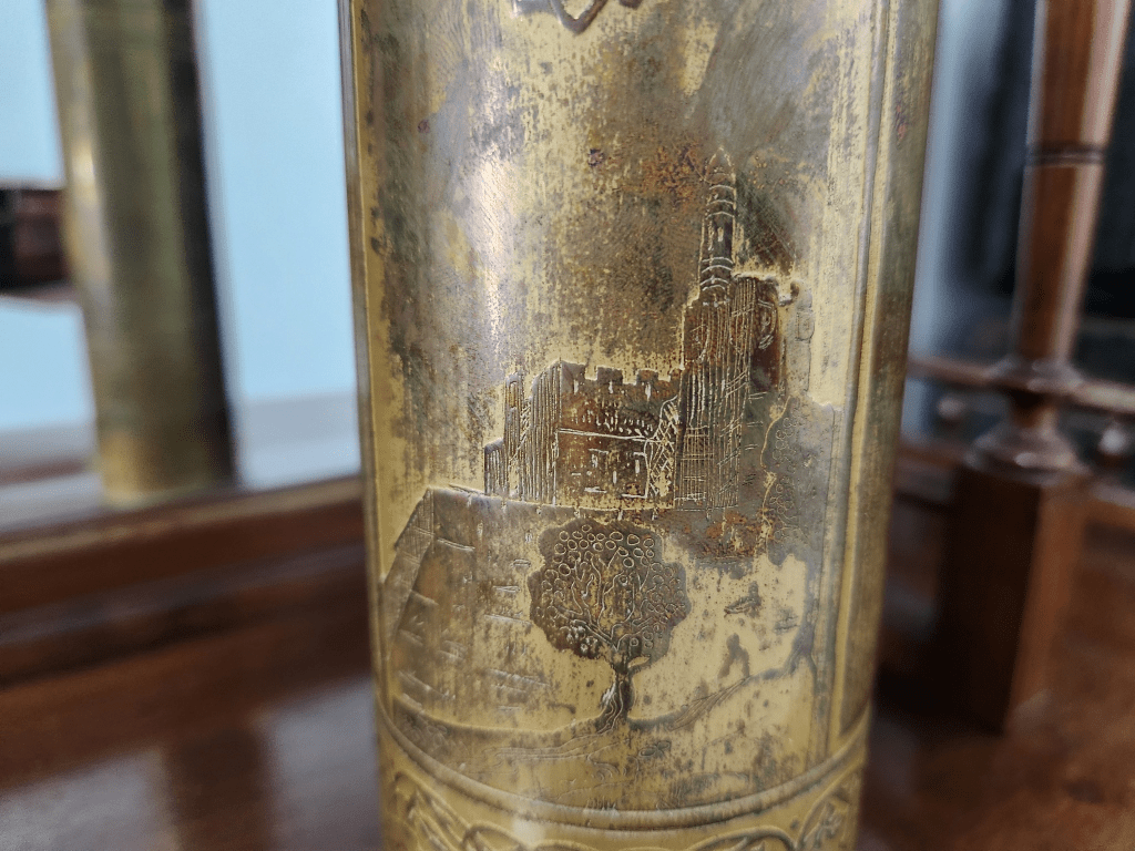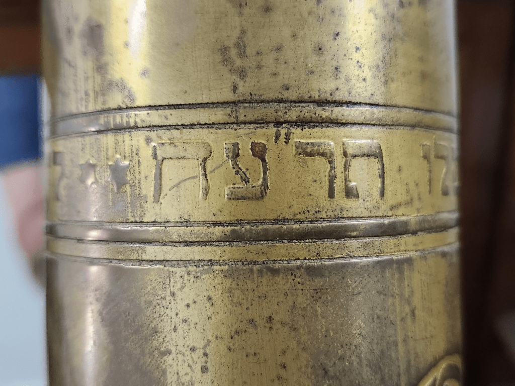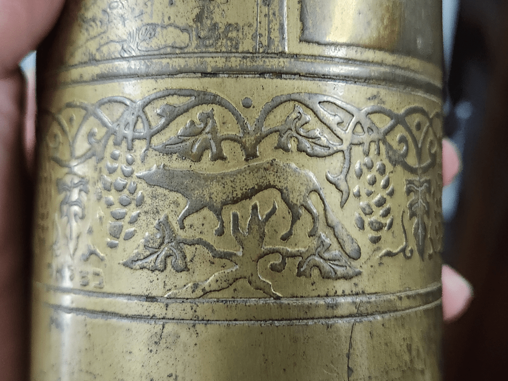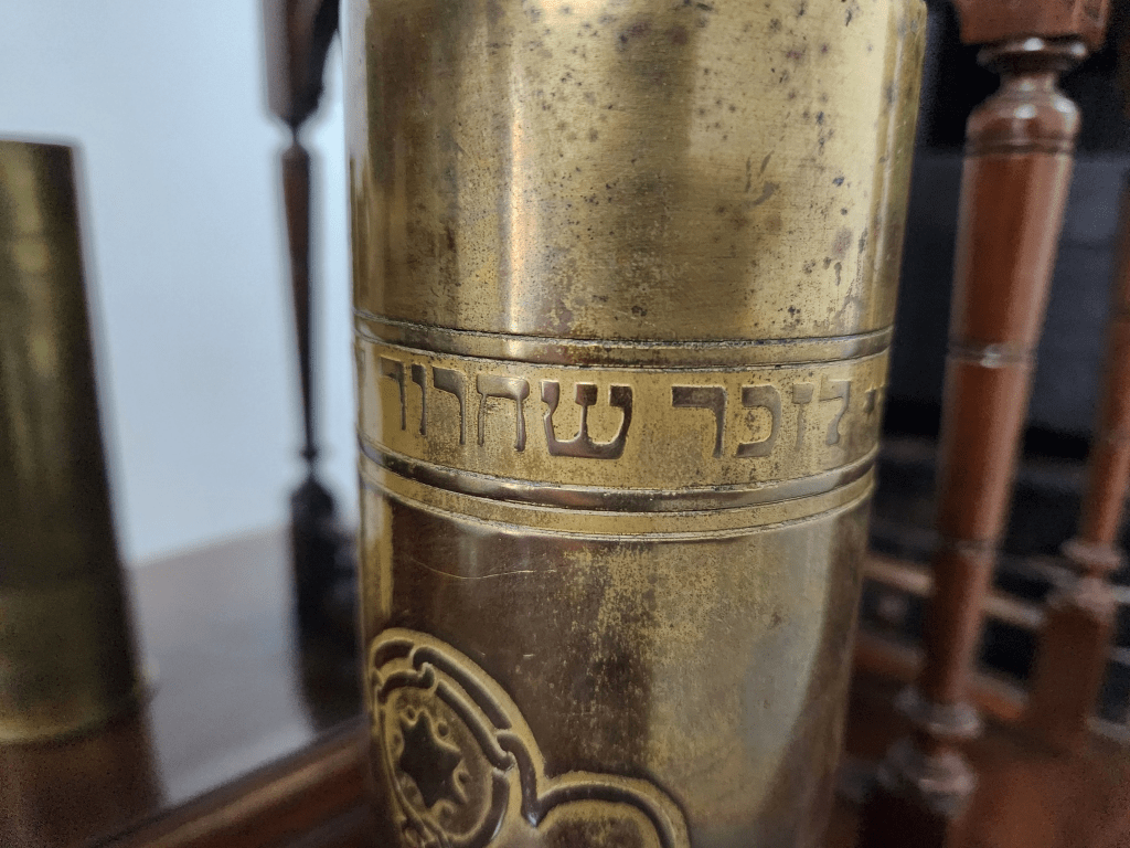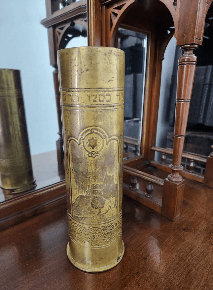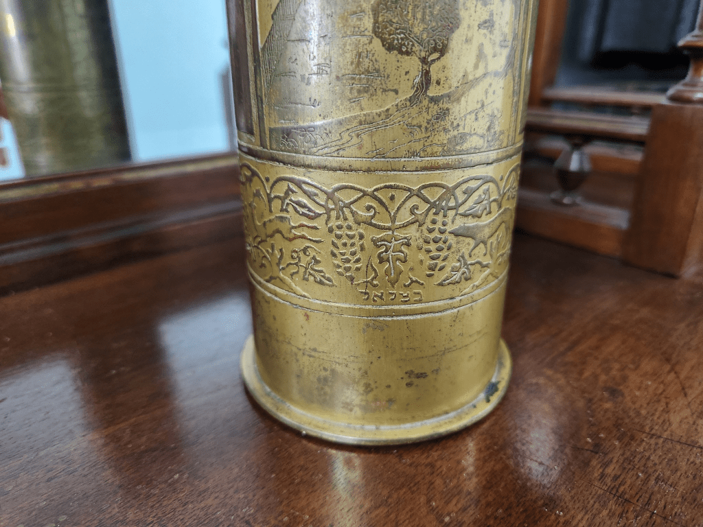 תראו מה נמסר לי לשמאות והערכה מקצועית לקראת המכירה הפומבית הבאה שלנו – פריט בצלאל משנות העשרים, עשוי מתרמיל פגז ומעוטר בעבודת צריבה של הכותל המערבי ומגדל דוד, עם הכיתוב 'לזכר שחרור ירושלים כ״ד בכסלו תרע״ח, מתוארך (1917-1918), חתום בצלאל.