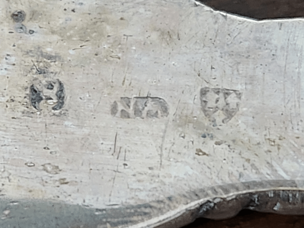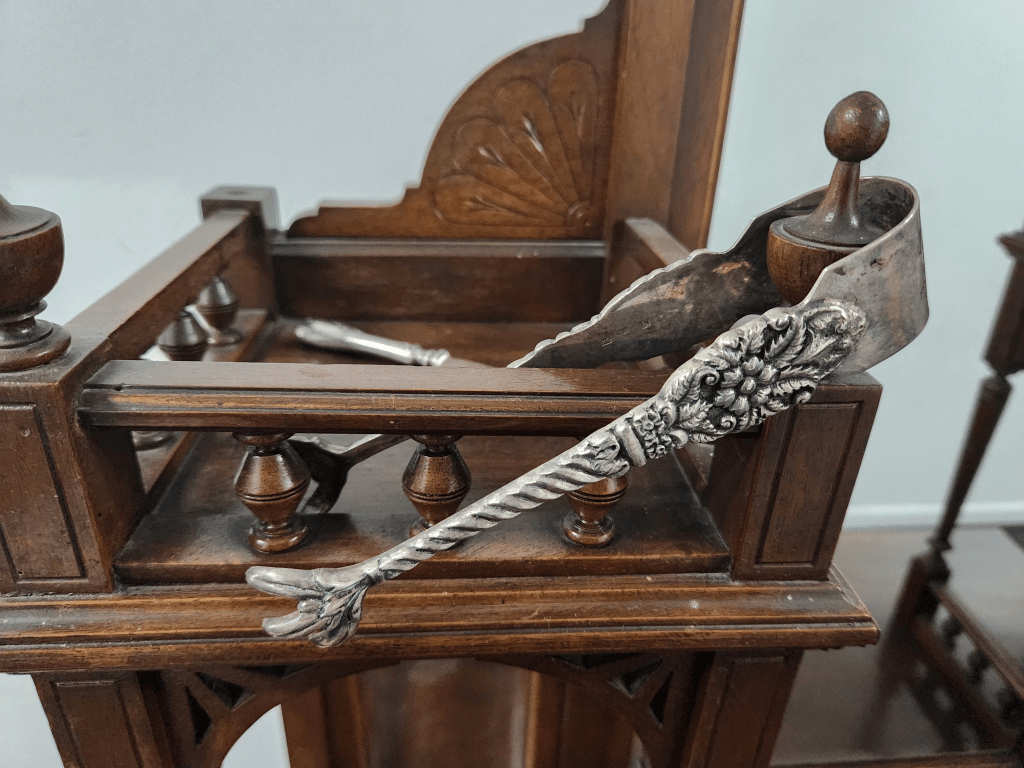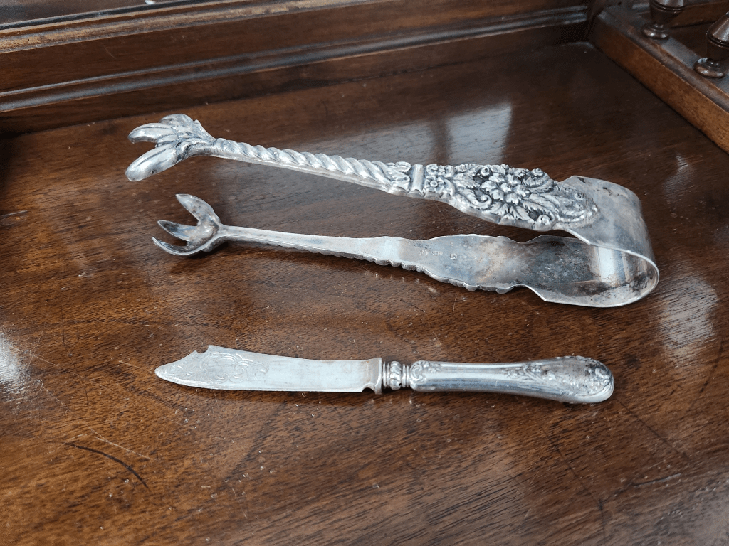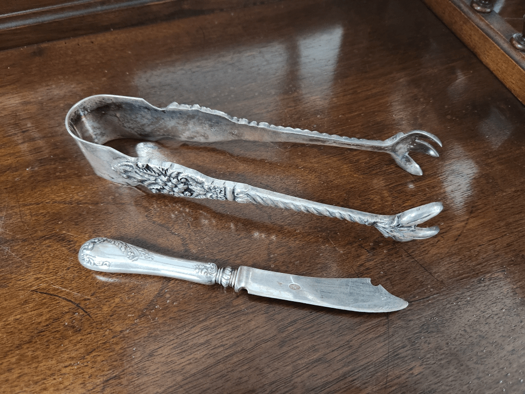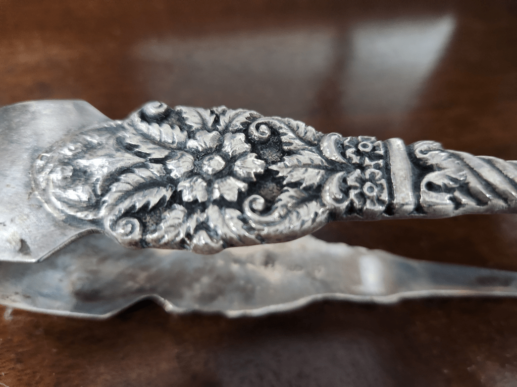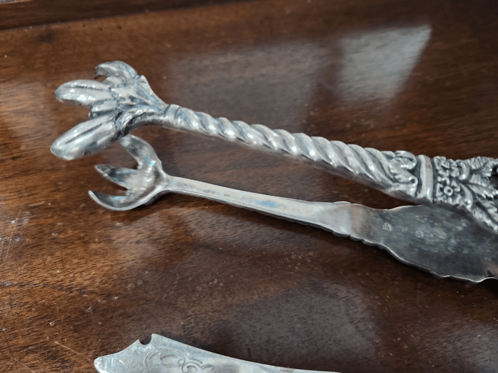 המלקחיים הגדולות והכבדות חתומות בחותמות כסף מהעיר צ'סטר באנגליה, קוד שנה לשנת 1870 וראשי התיבות: N.M (הסימן "N.M" של צורף הכסף בצ'סטר מתייחס ככל הנראה לנתנאל מילס (Nathaniel Mills), צורף כסף בולט מברמינגהם שרשם את הסימן שלו בצ'סטר. הוא היה ידוע בייצור פריטי כסף איכותיים) רוחב: 3 ס"מ, אורך: 18.5 ס"מ.