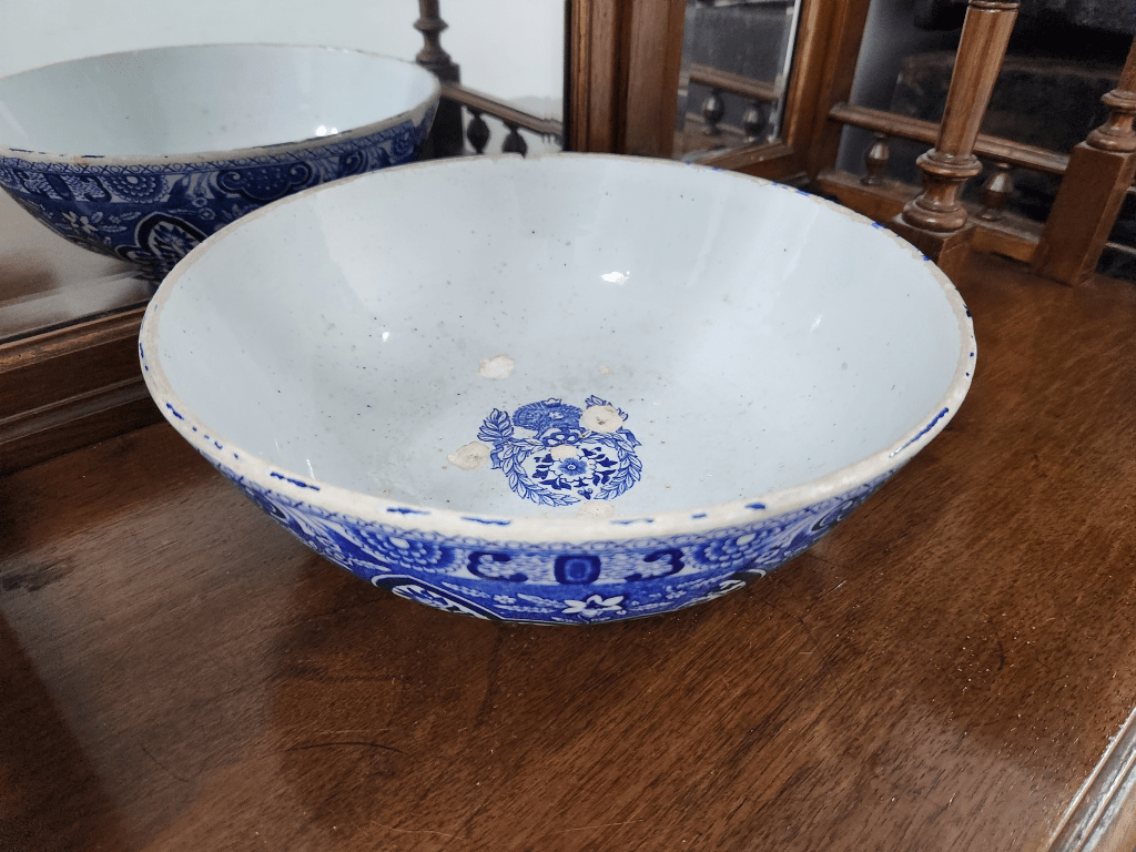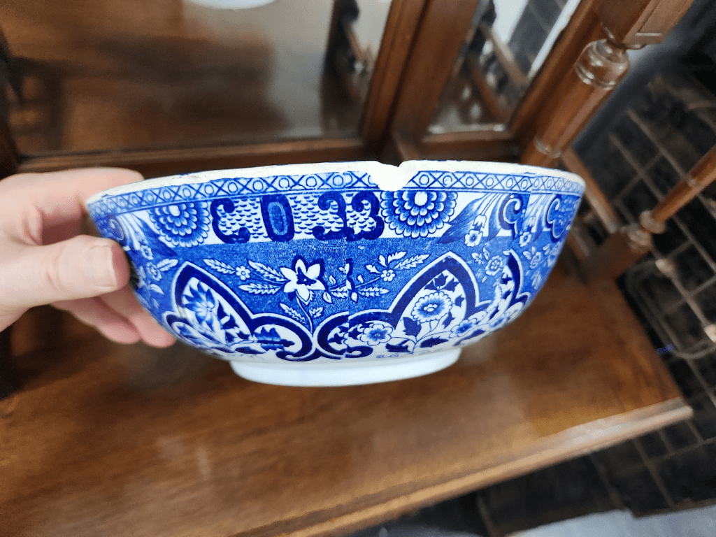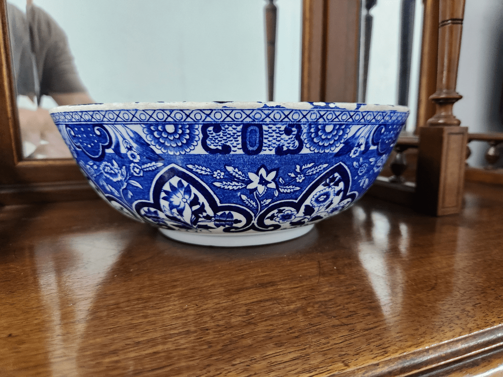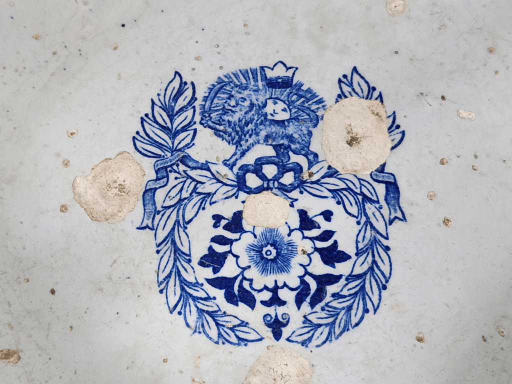 תראו מה נמסר לי היום להערכה מקצועית ולשמאות, לקראת המכירה הפומבית הקרובה שלנו – קערת חרס רוסית עתיקה ונדירה שיוצרה עבור השוק הפרסי, מתוצרת 'קוזניצוב' (Kuznetsov porcelain factory) מעוטרת בהדפס מועבר בכחול קובלט, חתומה (1890 – 1917), במרכז חלקה הפנימי סמן האריה והשמש הפרסי (סמלה של אירן), מספר קילופי זיגוג ופגמים קטנים לשפה (מצולמים)