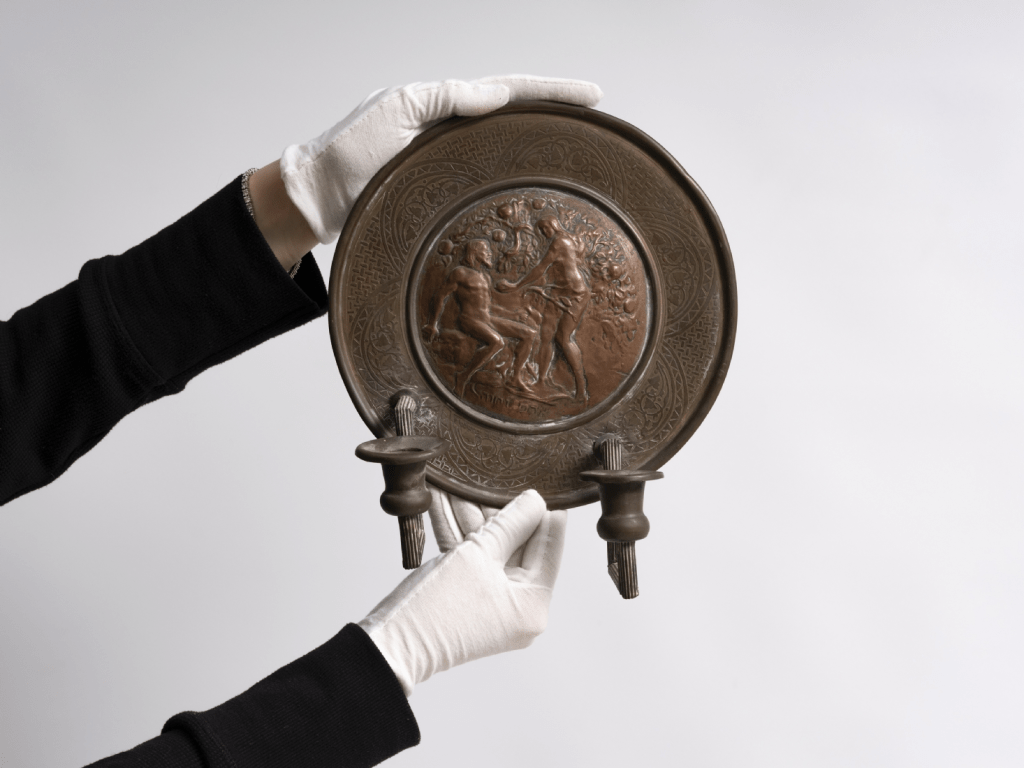 תבליט בצלאל (פמוט קיר) עשוי נחושת מעוטר בדמותם של אדם וחווה על פי זאב רבן