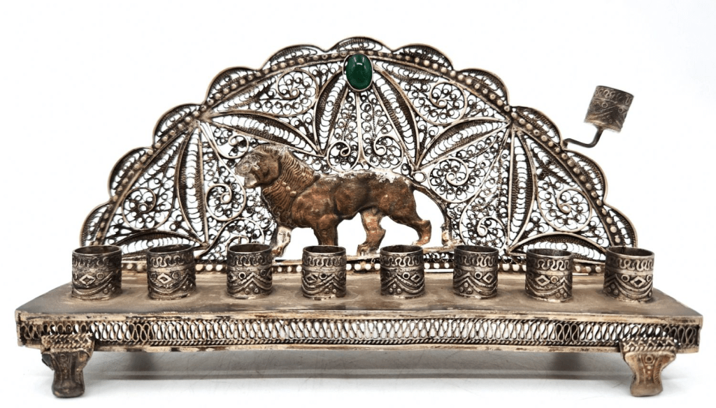 חנוכייה נדירה מתוצרת בצלאל, עשויה כסף, חתומה, עשויה בעבודת פיליגראן